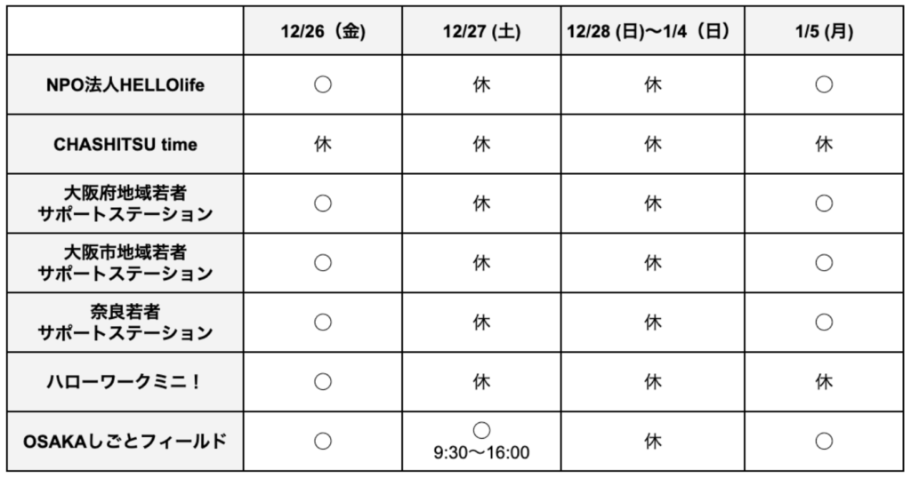 誠に勝手ながら、年末年始休暇のため、弊社が運営する各事業所は、それぞれ下記の日程で休業とさせて頂きます。