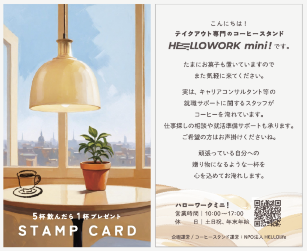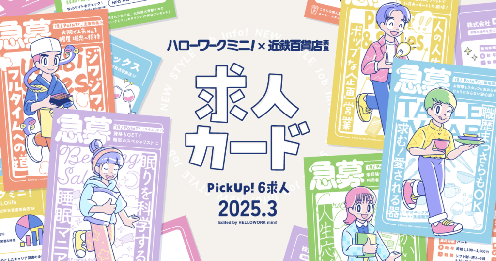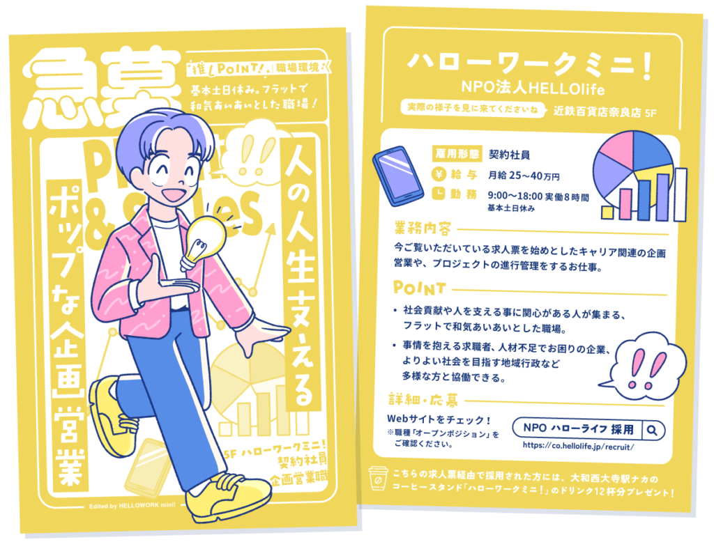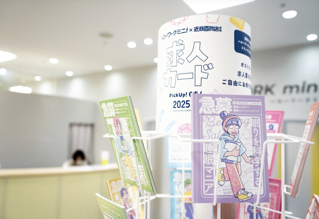 近鉄百貨店 奈良店と連携し、店舗ごとの求人情報を“ポストカード型求人票”としてデザイン・制作し、ハローワークミニ!の2拠点にて配布。目を引くデザインによって、多くの方に手に取っていただくことができました。