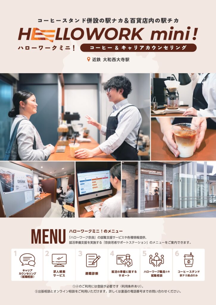 奈良労働局・近畿日本鉄道株式会社・株式会社近鉄百貨店の協力により、就業支援拠点「ハローワークミニ!」を近鉄大和西大寺駅と近鉄百貨店奈良店に開設しました。