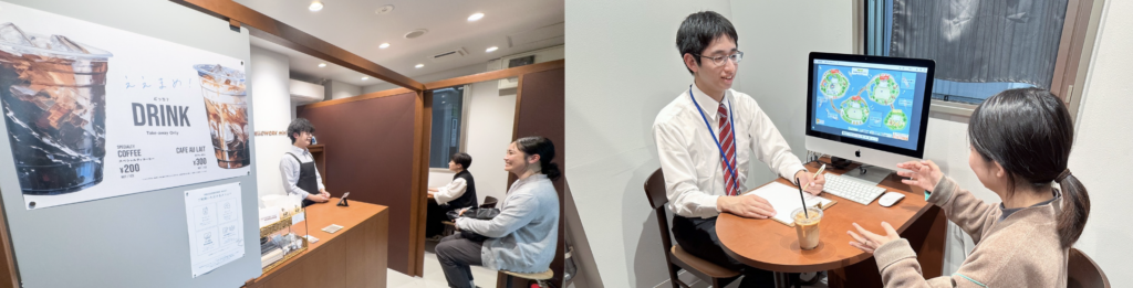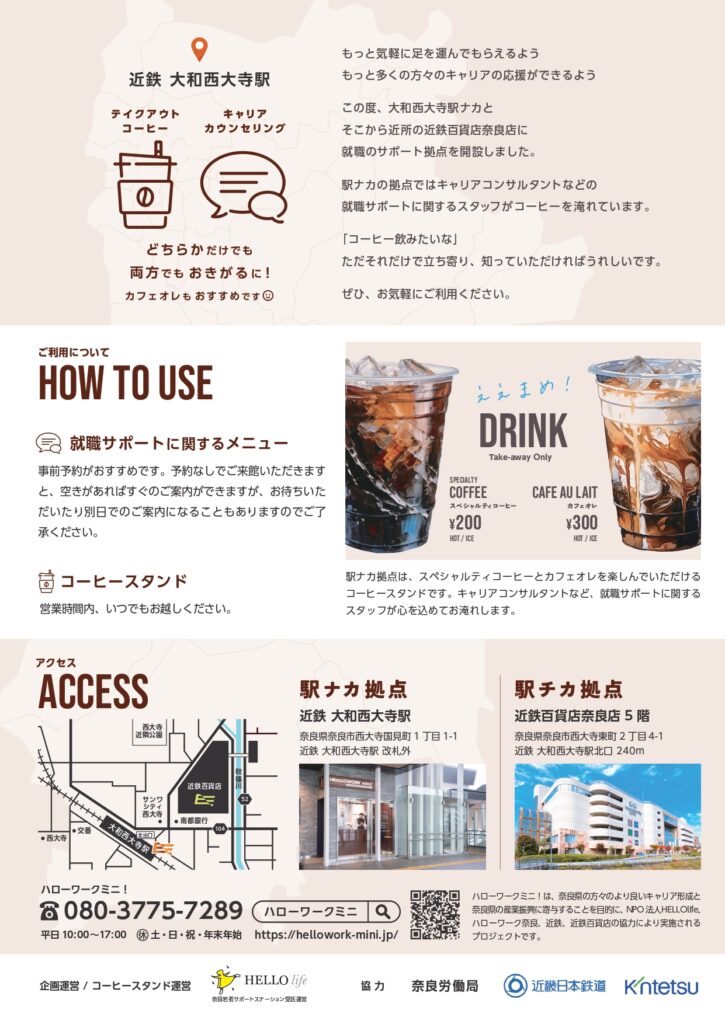 「駅ナカ拠点(大和西大寺駅)」と「駅チカ拠点(近鉄百貨店奈良店5階)」2ヶ所で運営し、ハローワークの就職支援サービスや各種情報提供、就活準備支援を実施する若者サポートステーションと連携した支援を実施しています。駅や商業施設に開設され、テイクアウト専門のコーヒースタンドを併設するなど、物理的にも心理的にも奈良県民がアクセスしやすくなっています。必要な人に必要な支援が届けられる仕組みとコンテンツにより、奈良県民のより良いキャリア形成と奈良県の産業振興に寄与します。